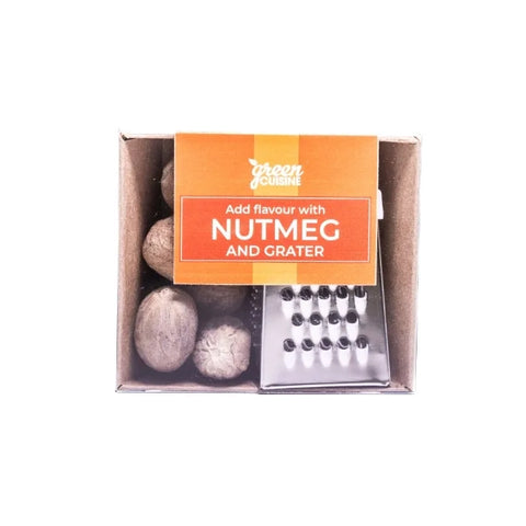 GREEN CUISINE Grater with Nutmeg in Box 15g includes a whole nutmeg paired with a small metal grater, packaged together in a compact box. This set allows you to grate fresh nutmeg as needed, giving dishes and drinks a stronger, more aromatic flavour than pre ground spice.