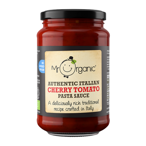 Mr Organic Authentic Italian Cherry Tomato Pasta Sauce 350g is an organic Italian pasta sauce made with 79% sun-ripened tomatoes, 12% cherry tomatoes, Italian extra virgin olive oil, carrots, basil, sea salt, sundried tomatoes, herbs and spices. It contains no added sugar and is suitable for vegan diets.