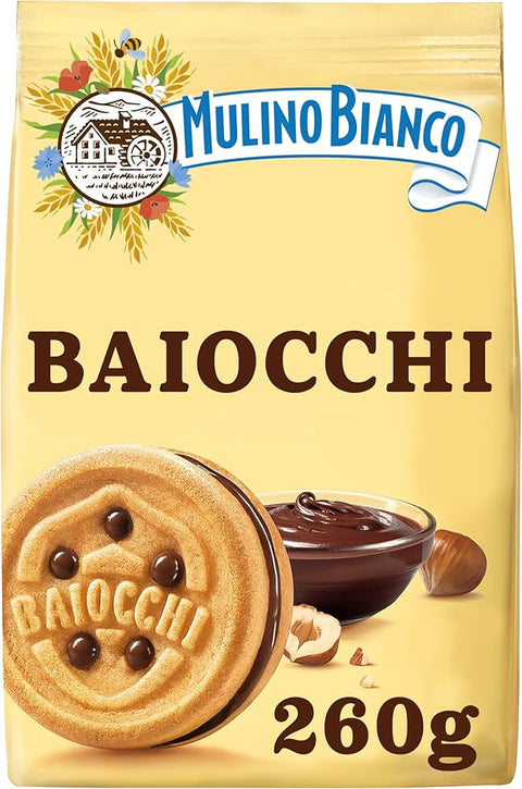 Mulino Bianco Baiocchi 260g are delightful Italian biscuits filled with smooth, velvety hazelnut and cocoa cream, nestled between two golden, crumbly cookies. Each bite offers a perfect balance of sweetness and texture, where the rich nutty filling complements the delicate buttery biscuit. Crafted with care and tradition, Baiocchi embody the warmth of Italian home baking, using quality ingredients and no artificial colours or preservatives. Ideal for enjoying with coffee, tea, or as a little indulgence throughout the day, these biscuits capture the comforting taste of Italy - authentic, satisfying, and irresistibly delicious.